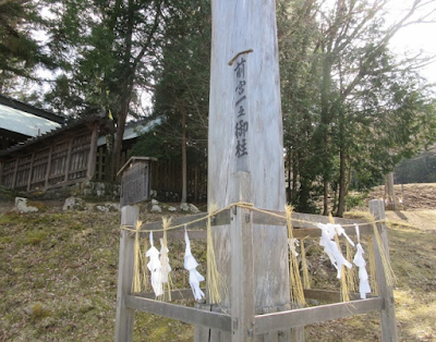 一之御柱。後方の樹木の陰から少し見えるのは四之御柱。